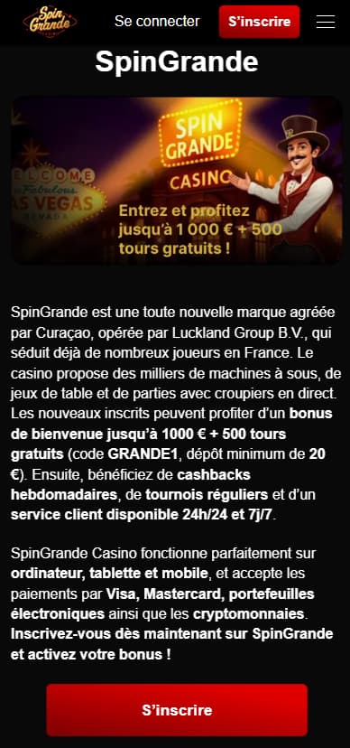 SpinGrande est une toute nouvelle marque agréée par Curaçao, opĂ©rĂ©e par Luckland Group B.V., qui sĂ©duit dĂ©jĂ  de nombreux joueurs en France. Le casino propose des milliers de machines Ă  sous, de jeux de table et de parties avec croupiers en direct. Les nouveaux inscrits peuvent profiter d’un bonus de bienvenue jusqu’à 1000 € + 500 tours gratuits (code GRANDE1, dĂ©pĂŽt minimum de 20 €). Ensuite, bĂ©nĂ©ficiez de cashbacks hebdomadaires, de tournois rĂ©guliers et d’un service client disponible 24h/24 et 7j/7.