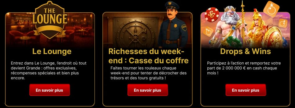 SpinGrande conçoit ses promotions de maniĂšre transparente et avantageuse. Les conditions de mise, les dĂ©lais et les rĂšgles sont clairement indiquĂ©s afin que les joueurs français sachent toujours comment fonctionne chaque offre avant dây participer.
