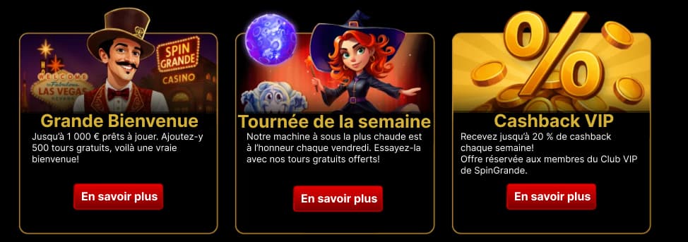 SpinGrande conçoit ses promotions de maniĂšre transparente et avantageuse. Les conditions de mise, les dĂ©lais et les rĂšgles sont clairement indiquĂ©s afin que les joueurs français sachent toujours comment fonctionne chaque offre avant dây participer.